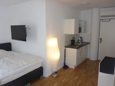 Moderne, gehobene Ausstattung. Vollständig möbliert. Hochwertiges Fertigparkett im Wohnbereich. Bad und Dusche sind hell und modern gefliest. Die Apartments verfügen über: Kleiderschrank, Spiegel, Bett, Schreib-/Esstisch, Stühle, LCD-TV, WLAN und eine kleine, moderne Single-Küche mit Mikrowelle. Kaffemaschine, Wasserkocher, Besteck, Töpfe, Pfannen,Gläser und Kochgeschirr sind bei uns selbstverständlich. Mit Klimaanlage und Dach-Lounge für alle Gäste. |
