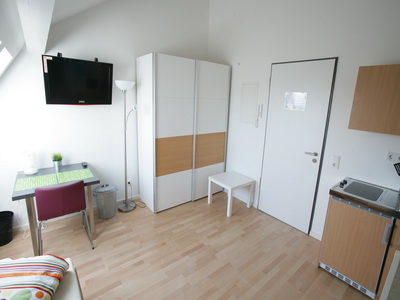 Moderne, gehobene Ausstattung. Vollständig möbliert. Hochwertiges Fertigparkett im Wohnbereich. Bad und Dusche sind hell und modern gefliest. Die Apartments verfügen über: Kleiderschrank, Spiegel, Bett, Schreib-/Esstisch, Stühle, LCD-TV, WLAN und eine kleine, moderne Single-Küche mit Mikrowelle. Kaffemaschine, Wasserkocher, Besteck, Töpfe, Pfannen,Gläser und Kochgeschirr sind bei uns selbstverständlich. Dach-Lounge für alle Gäste. |